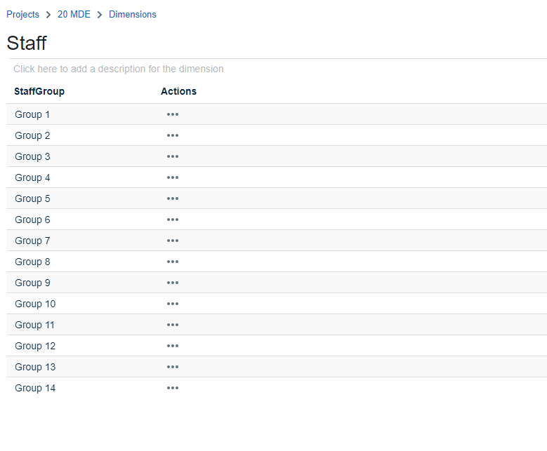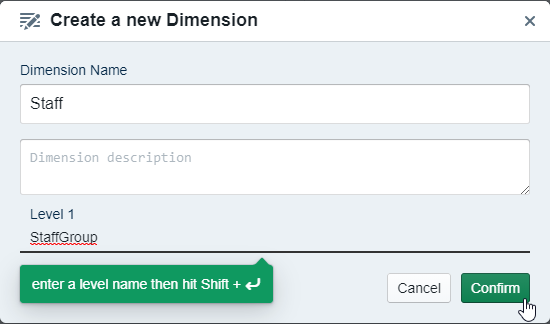 First of all, create a dimension called 'Staff' and call the Level 1 'StaffGroup'. Then upload Staff.xlsx to fill in all the different values.