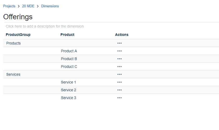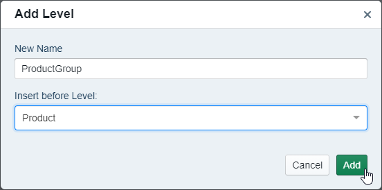 Next, create a dimension called 'Offerings' naming the Level 1 'Product'. Now add the level 'ProductGroup' above Product. Afterward, you can upload Offerings.xlsx.