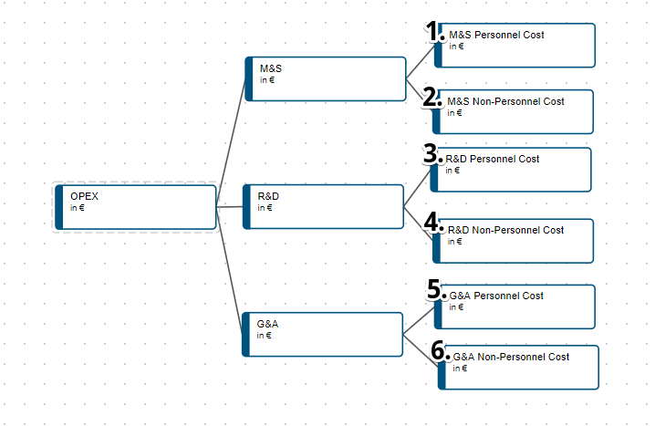 Operative Expensive (OPEX) are in our case modeled as the sum of the three nodes: "M&S", "R&D" and "G&A": (Marketing & Sales, Research and Development, General & Administrative)