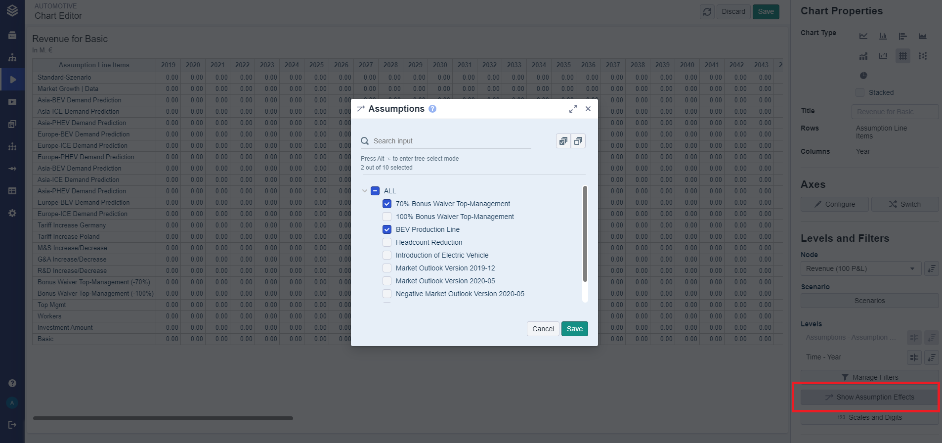 You can select "Show Assumption effects" for any chart. This allows you to display the assumption effects using line and bar charts or tables.