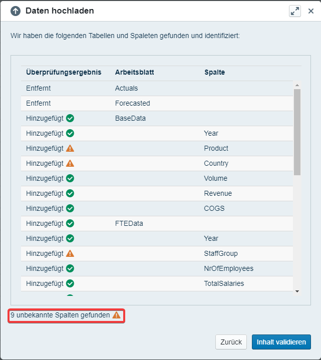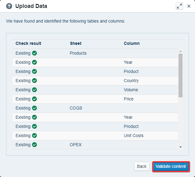At this point, the software will display an overview showing which columns and tables were recognized. If everything is ok, you can hit 'Validate Content'.