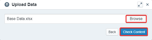 Since we are back in the data upload wizard, you can select 'Upload' next to the previously created data source. Now 'Browse' and select the excel file containing the desired data. Hit 'Check Content' once it's selected.