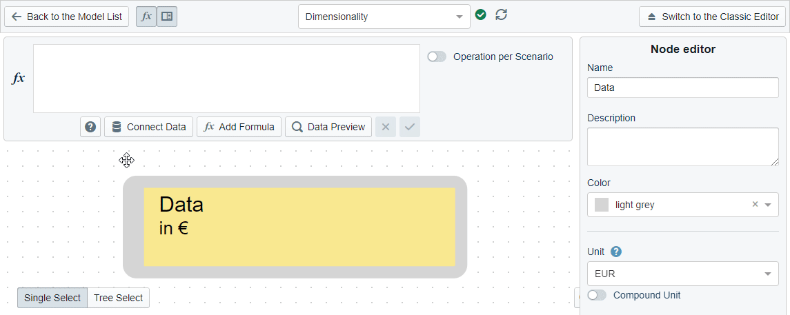 Using the connect data button at the formula ribbon, you can now select the data you want to use using a drop-down menu of all your available data sources.
