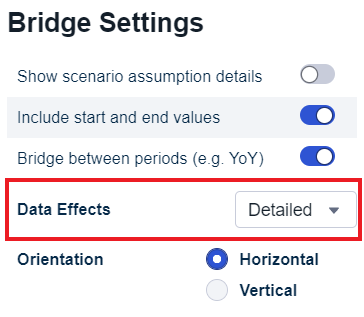 Set the data effects setting in the workspace of your chart to "Grouped". Now your bridge displays grouped data effects.