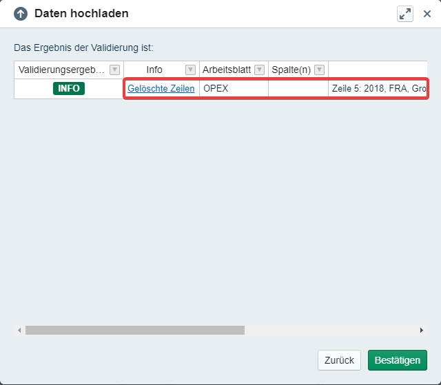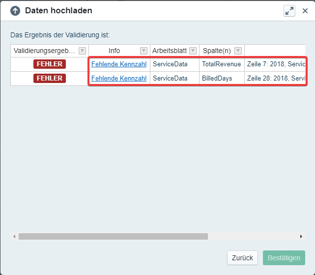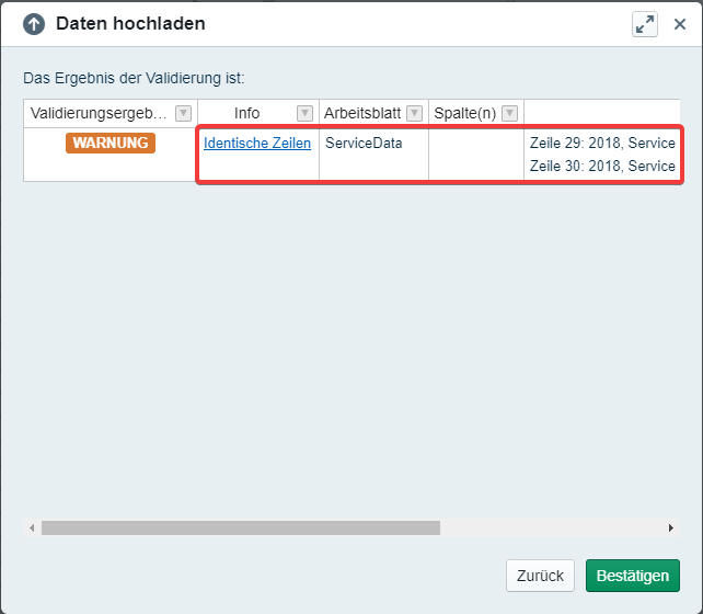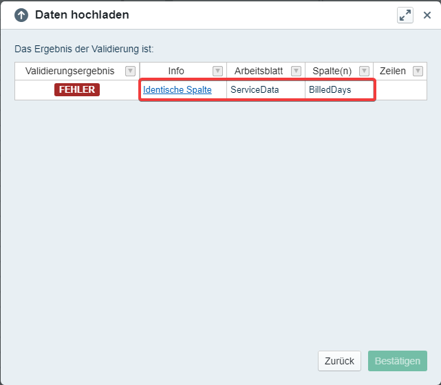 When we try to upload said data source, we'll receive the error "Duplicate column". The data upload wizard also shows which sheet and column are affected. Just delete the highlighted, redundant column and you are good to go.