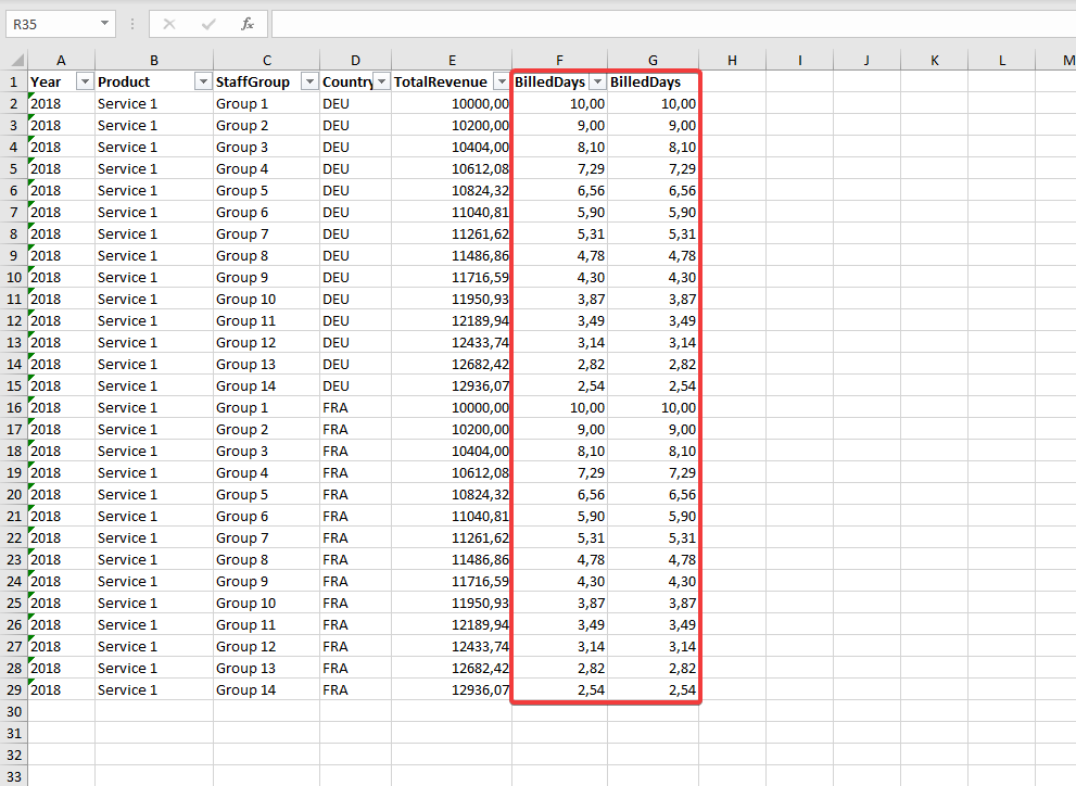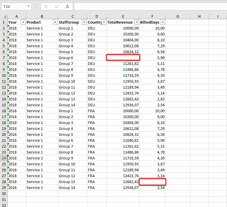 Our Excel document is missing two values in the columns "TotalRevenue" and "BilledDays".