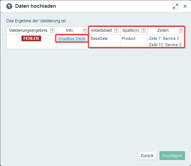 When we try to upload our base data we get the error 'Invalid Value'. The data upload wizard also shows us which values are affected. Here we can see that lines 7 and 13 in the column 'Product' are affected.