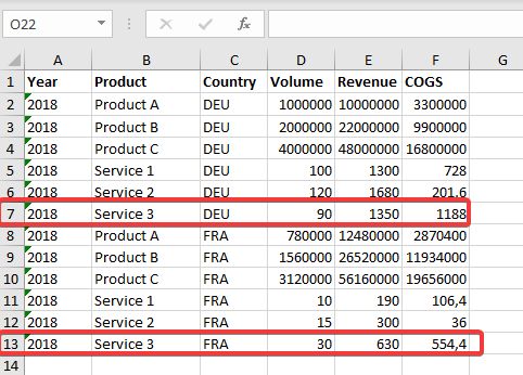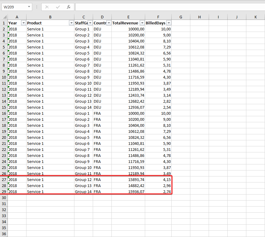 The Excel document containing our base data is referencing the level value 'Service 3' in lines 7 and 13.