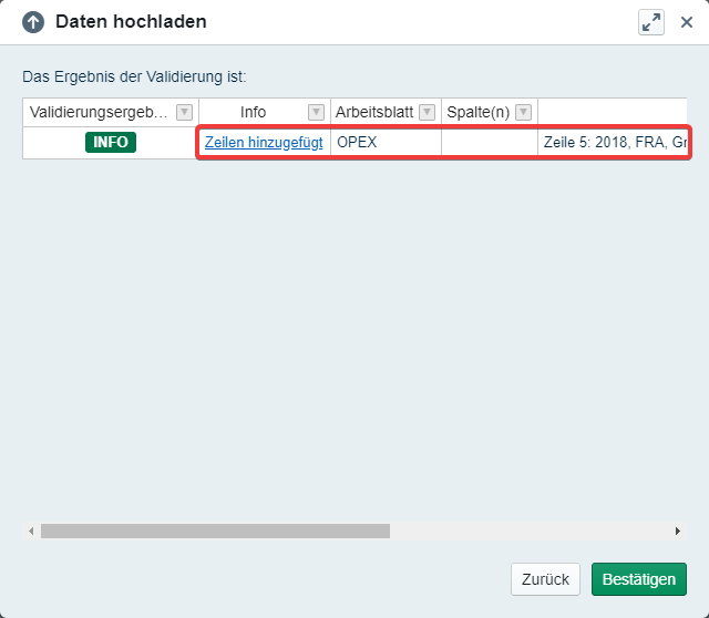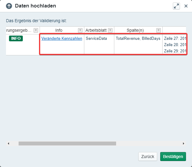 Once we upload the file, the data upload wizard will show us which rows were modified.