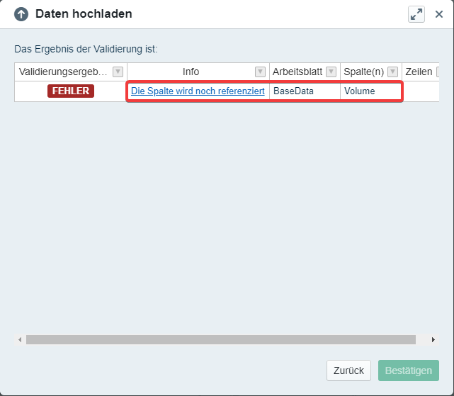 If we try to upload it the error 'column still in use' will appear. To resolve it, we can either add 'Volume' back to our file or remove the reference from the submodel.