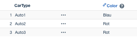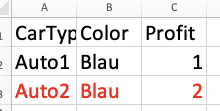 In the example below, "Auto2" has a linked Color "Blau" in the excel file, but "Rot is linked in the dimension management.