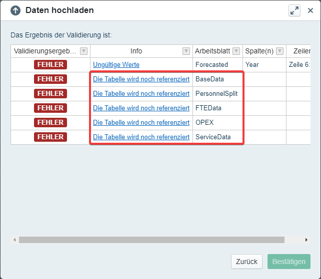 If we try to upload this document the data upload wizard will show the error ‘table is still in use’. To fix this we can either copy the worksheets from the old into the new Excel document or remove all references to the old worksheets inside our model.