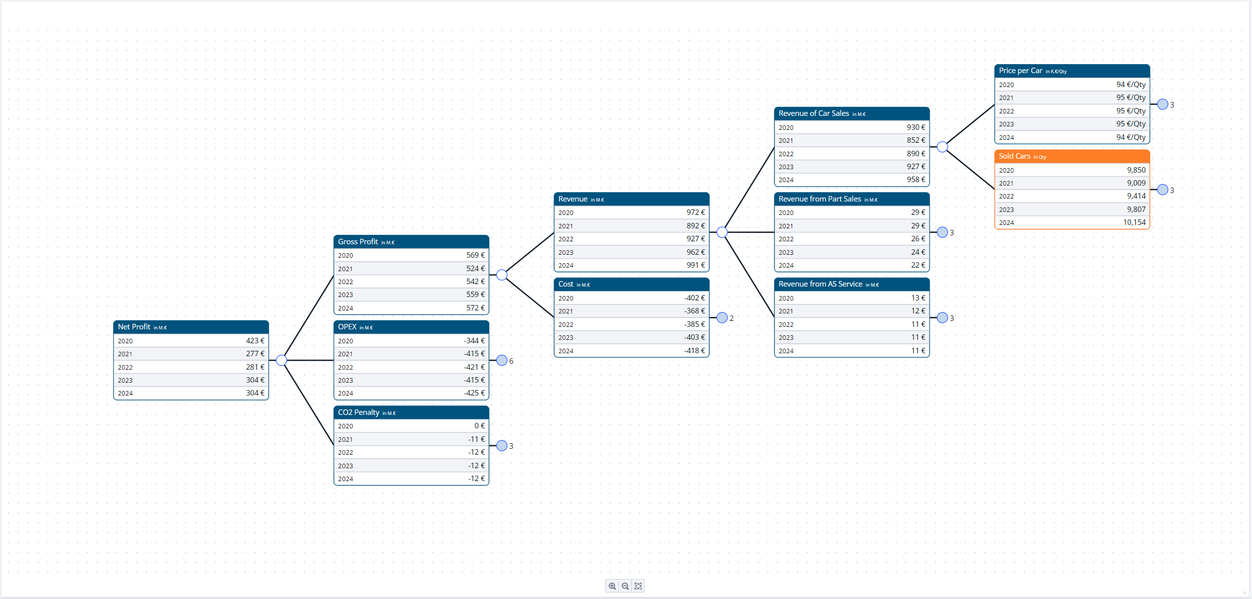 Model Tree | Shows the graphical Value Driver structure of the underlying Model and allows the display of values for multiple Scenarios inside of the Nodes. | Model trees are useful to understand how data flows through a model and impacts top KPIs. | ![]() |