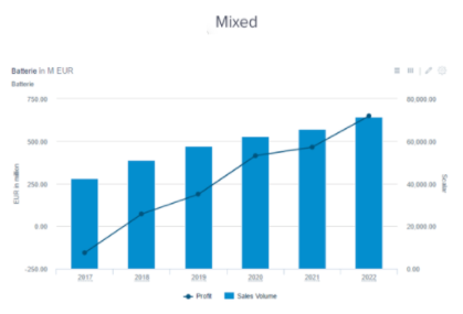 Mixed Chart | This chart is a combination between a stacked Column chart and a Line chart. By default, data series are displayed as stacked vertical bars, but it is possible to configure single data series to be displayed as a line. | Mixed charts can be used to display the relations between multiple key figures. | ![]() |