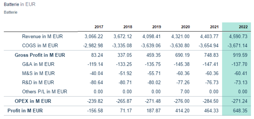 Table | Displays data in a tabular format and flexibly selecting dimensions for the rows and columns. In tables, you can display a lot of information from different key figures and their sub - figures across multiple Dimensions and compare different Scenarios. | With tables, you can, for example, build profit and loss statements, cash-flow statements and more. In Valsight you have the ability to do so in an aggregated or detailed format. | ![]() |