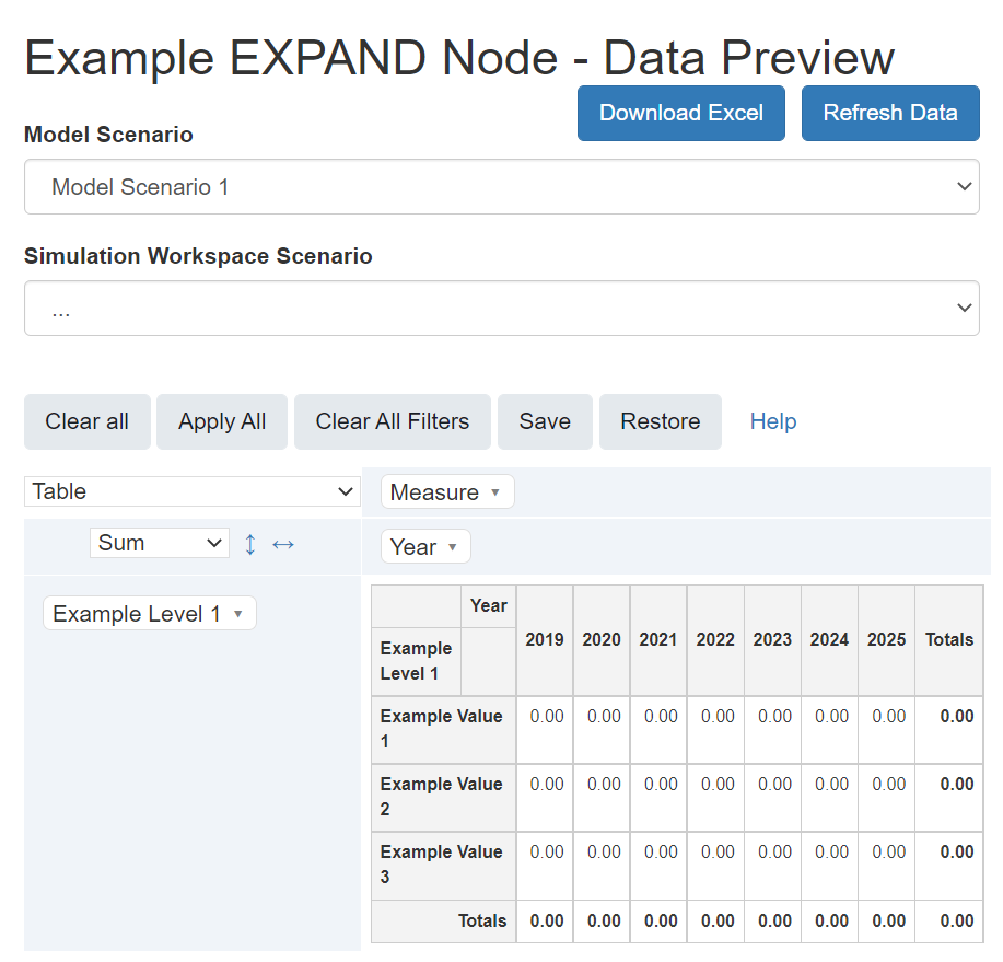 Description | Expands the node by the desired levels. The result is a cross product of all rows of the node with all values of the level entered in the formula. |