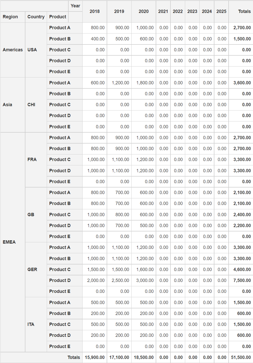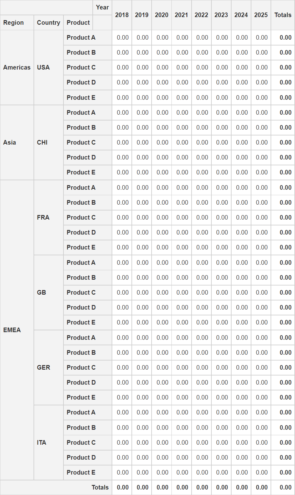 We fill the simulation node with EXPAND(0, “Year”, “Country”, “Product”) to create the same levels as the base data node but with only “0” as content. This results in making the simulation node eligible for use with ROLLFORWARD().