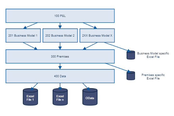 The 20X Models use base data from the 400 and 300 models to define business model specific logic. They typically define how base data (no info about future) and premises (info about future) are combined to create a simulated outcome. Additional drivers that are only relevant for this business model can be modeled here. It is advisable to retain the Org dimension in this model, as it eases the combination in the next layer. Alternativly the data can be pulled into the next layer with the expand single functionality.