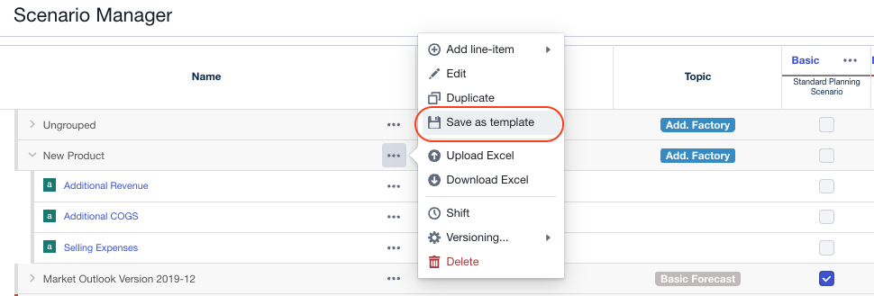 To create templates you first define a normal Assumption (Creating Assumptions) in the Scenario Manager and add all the required Line-Items. Once you have your Assumption ready, open the context menu and press 'Save as Template'.