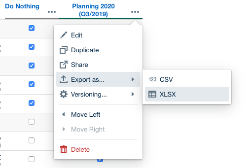 You can now download the data for existing scenarios from the Scenario Manager. In order to do that, go to the workspace, click on the scenario menu in the Scenario Manager and click on "Export as → XLSX".