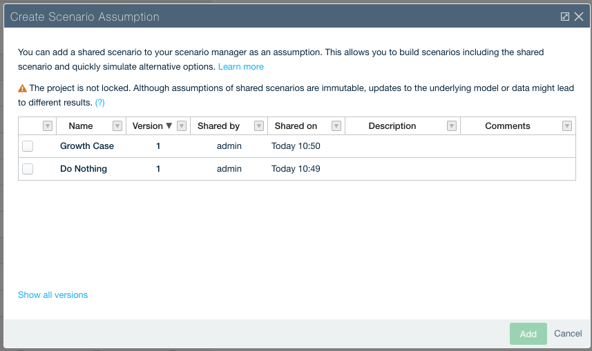 Users will be informed that a project is not locked when creating scenario assumptions. This is to prevent confusion; while the assumptions of shared scenarios cannot be changed, the underlying model to which they are applied could be unlocked and thus edited. This could lead to some sudden changes in the calculation results that might be hard to comprehend at first.