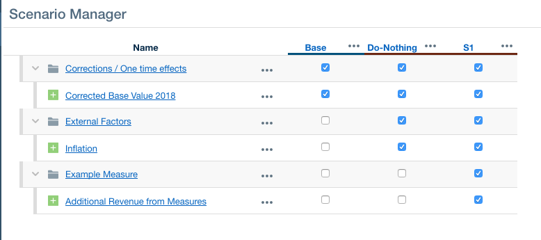 We create the “Base” & “Do-Nothing” scenario. The base correction only influences the base revenue and accounts for one-time effects that should not go into the basis for our simulation.