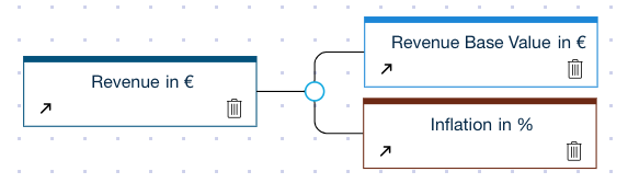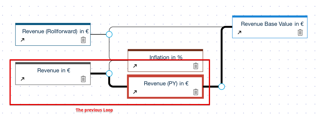 The Rollforward function is used to create all future values of the Revenue. An assumption on this node will only influence the result, e.g. an additional line-item on revenue will be added as it is, with no additional inflation applied.