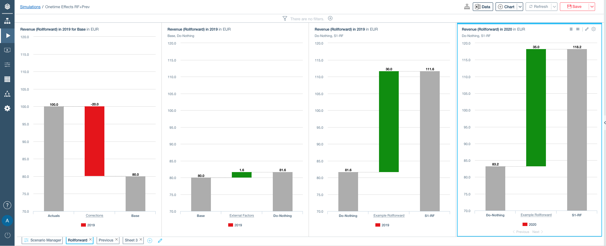Let's look at the differences in the simulation now. Since each value that we add as Assumption Line-Item on Revenue is now part of the loop, the values need to be entered as delta values to the previous year. Suppose we want to model a Line-Item that leads to 30 EUR extra revenue in 2019, 35 in 2020, and 40 in 2021. (all vs. the base year).