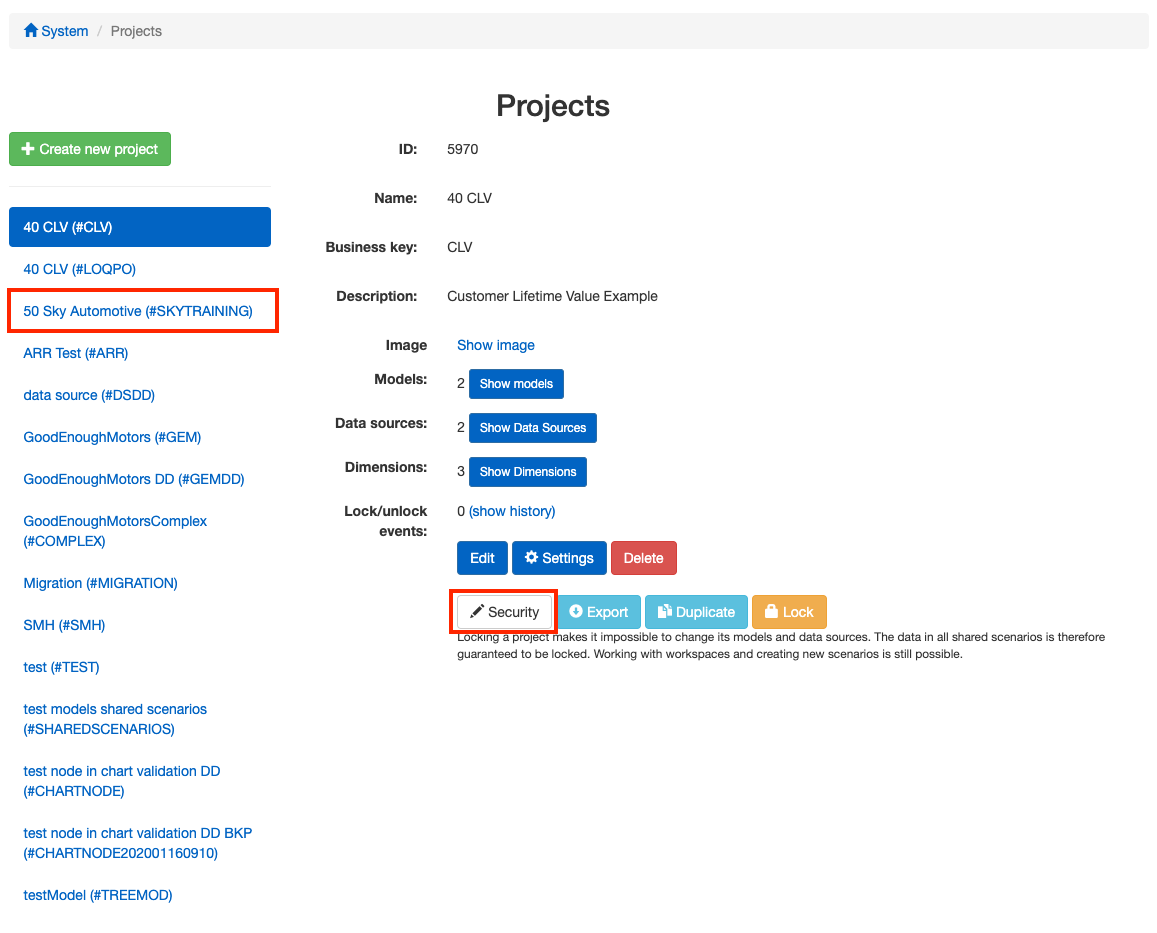 To get started, select the menu entry "Configuration". Now select the project that you want to change permissions for from the list on the left (We will select "50 Sky Automotive"). Then select "Security".