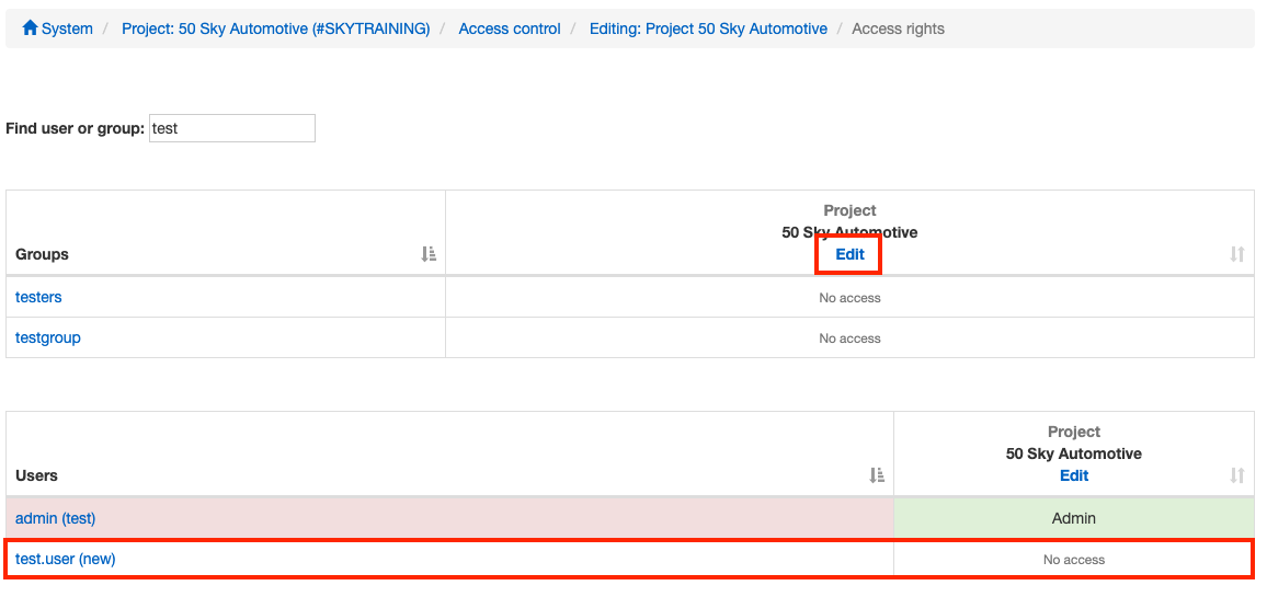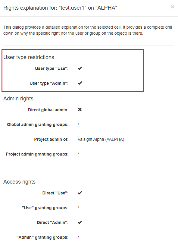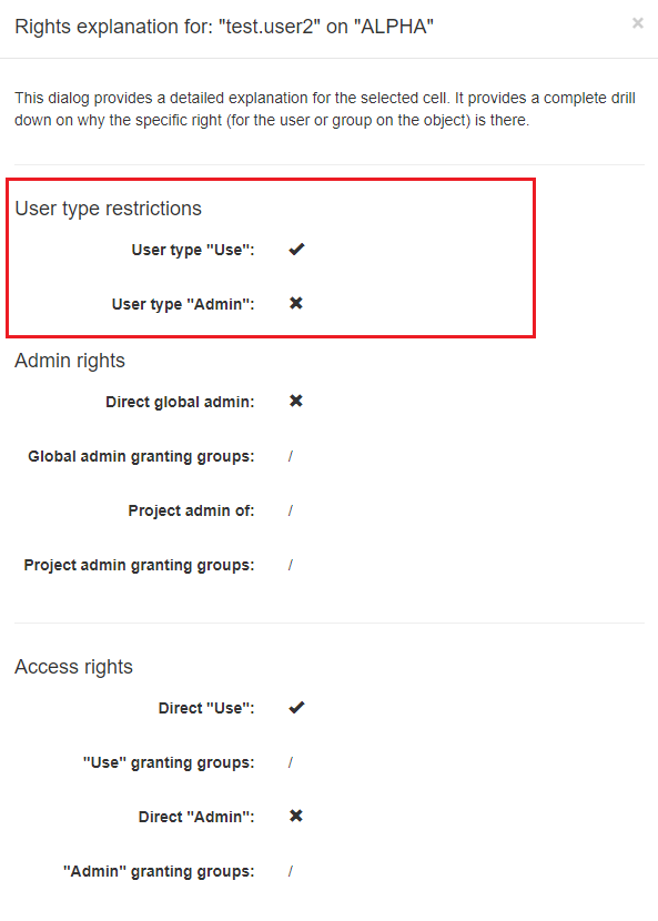 In this case, you checked the access rights of an unrestricted user type (test.user1) with admin rights in the project ALPHA.