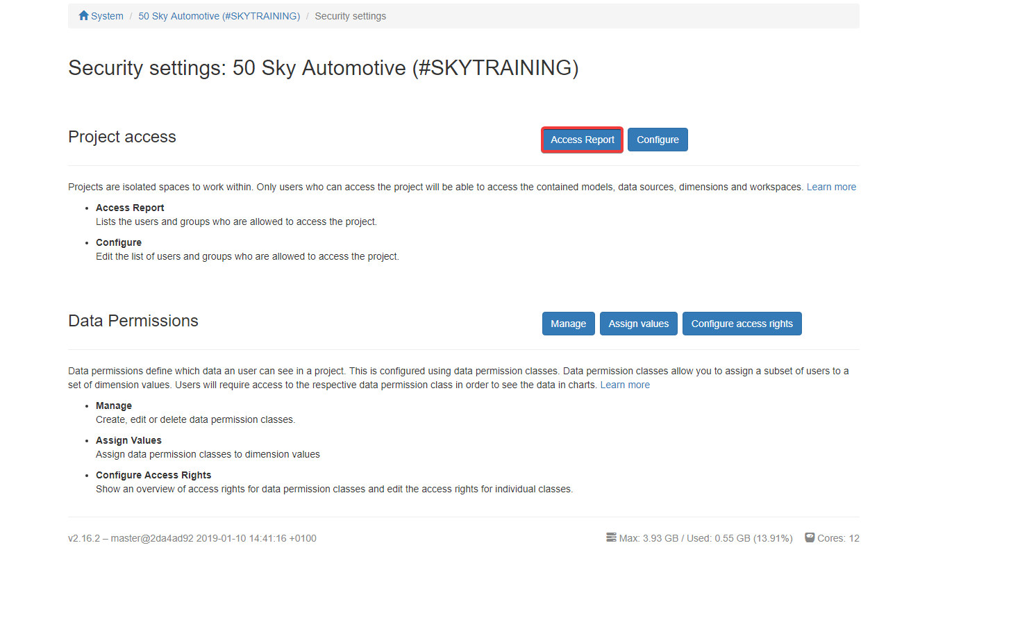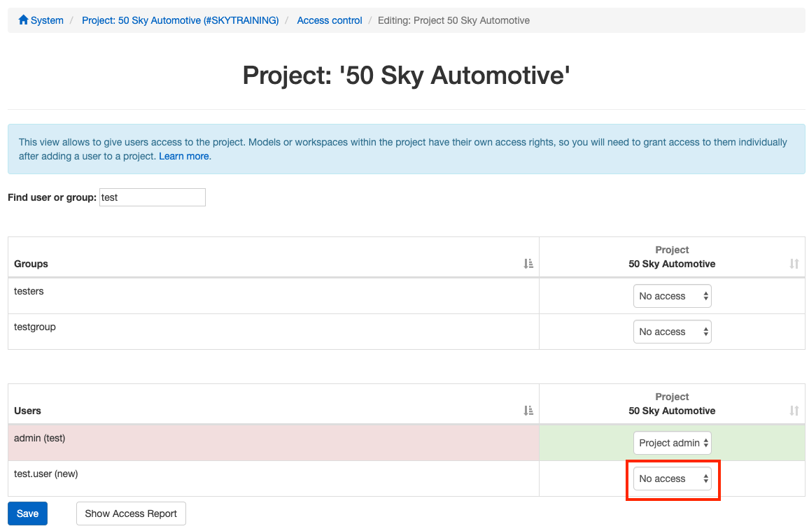 Now you have become acquainted with one way to edit permissions on a project ("Configuration" > "Security" > "Access Report"). But there is another one ("Configuration" > "Access control") which also lets you also change permissions on workspaces and models.