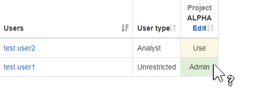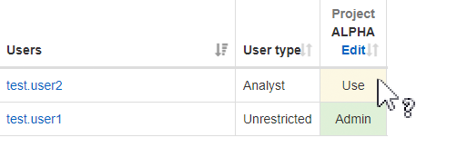 In another case, you need to check the access rights of for example an Analyst (test.user2) in project ALPHA.