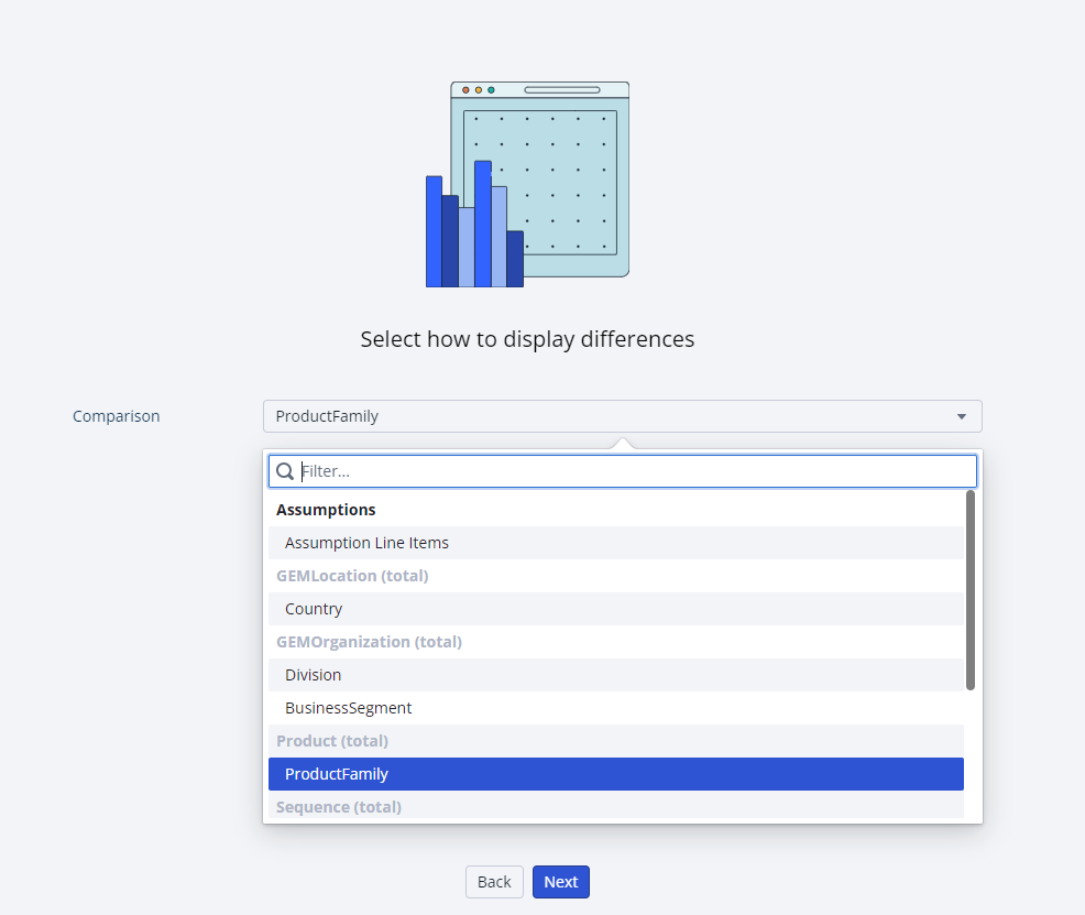 Select how you wish to visualise the difference, via assumptions, line items or a dimension
