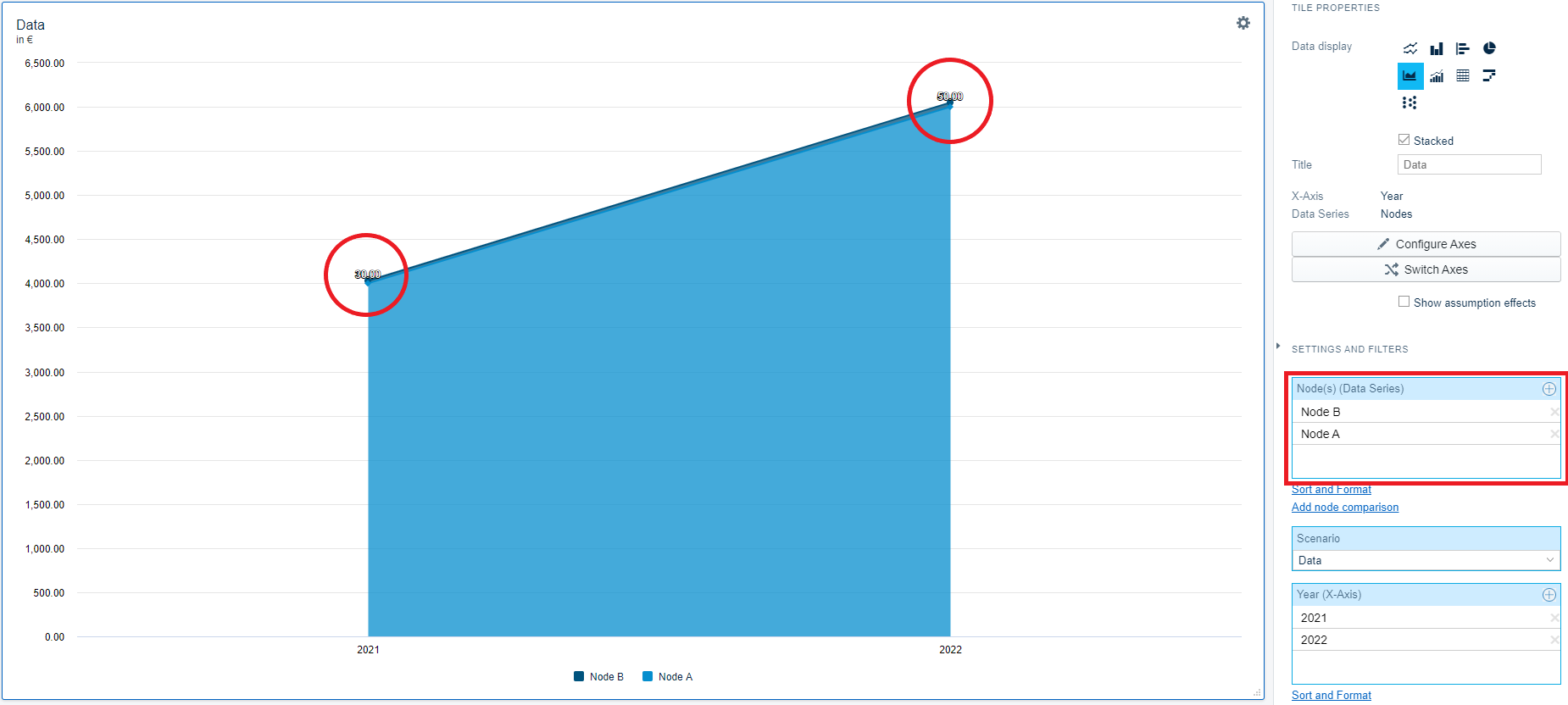 A reoccurring issue related to Area Charts and Line Charts is, that the sorting of the Nodes (data series) influences the priority of labels in the Chart.
