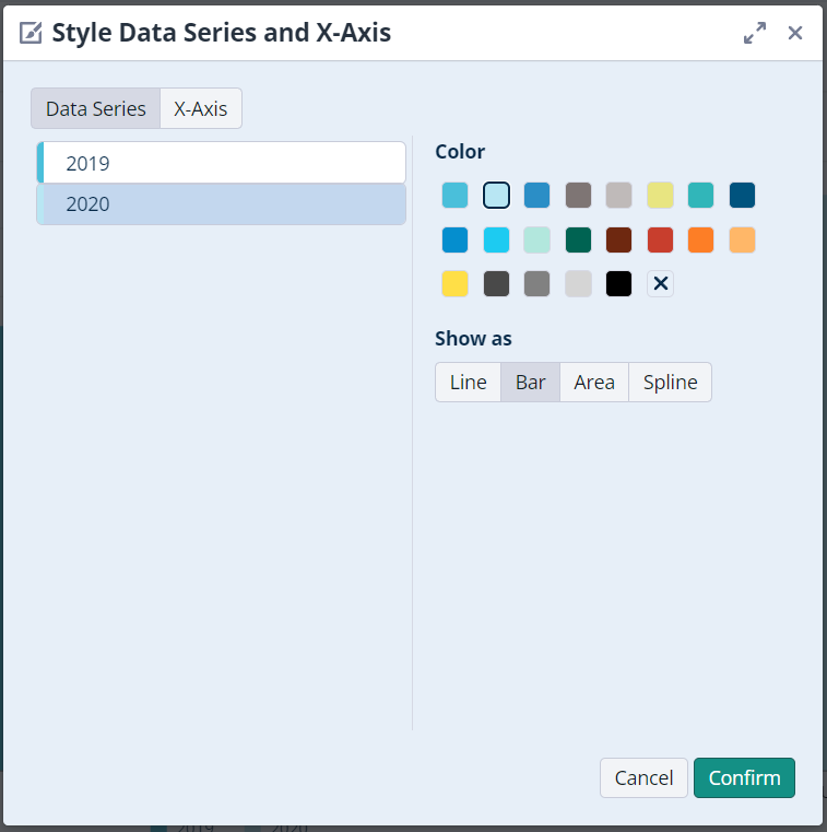 Here you have the option to assign colors to each column/data series in your chart. From version 6.4.0, you will also have the ability to flexibly format many more characteristics, such as: