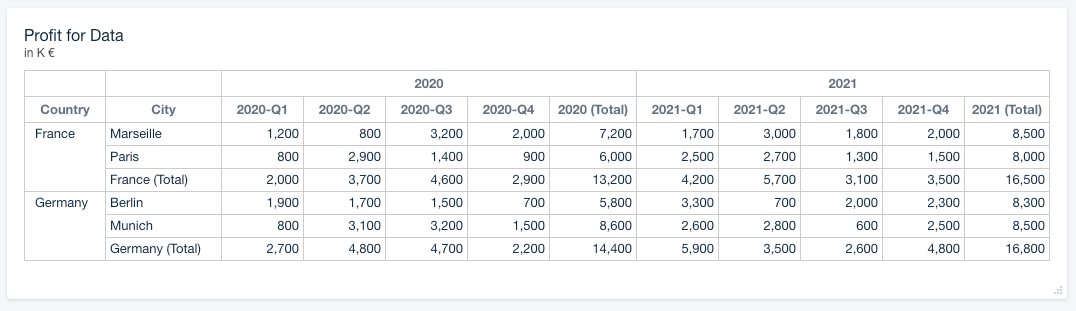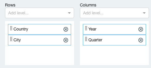 In the example below we added ‘Country’ above ‘City’ and ‘Year’ above ‘Quarter’ to display upper levels in merged cells and add columns with totals.