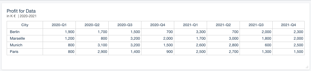 Note that levels have to be part of the same Dimension to be displayed as merged cells. In this example we used the Dimension Location with the levels Country and City and the Dimension Time with Year and Quarter.