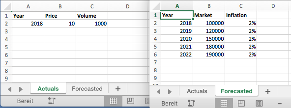 In this tutorial we will calculate the market share based on "Volume" and "Market data", you can of course also just upload the according data. However, it gives us the opportunity teach you the most important formulas. When building your own model you should start by determining what kind of data can be obtained easily and in high quality from your systems.