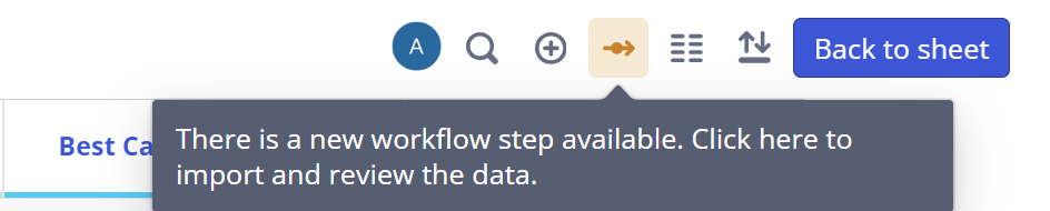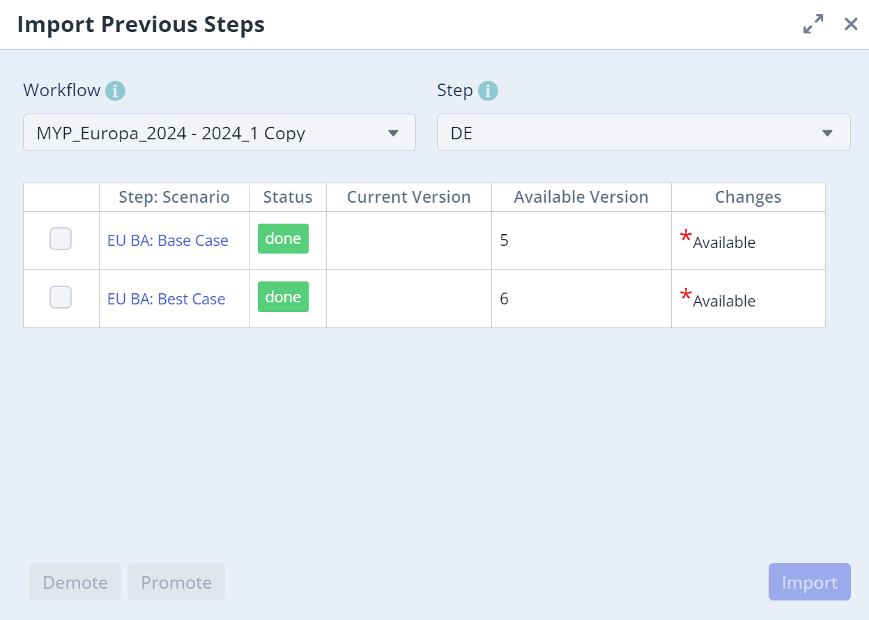 You can view each Workflow step and your submissions by clicking on the Workflow icon (2). To start work on your Workflow step and associated Scenarios, it may be necessary to use a Scenario from another user or department as input. For example, base assumptions that you can build on and simulate. To see all the previous steps you need to start building your Scenario, navigate to 'Import Previous Steps'. If you are part of multiple Workflows, you may need to select the desired Workflow and step first. If you are unsure which is correct, contact the Admin or creator of the Workflow to check.