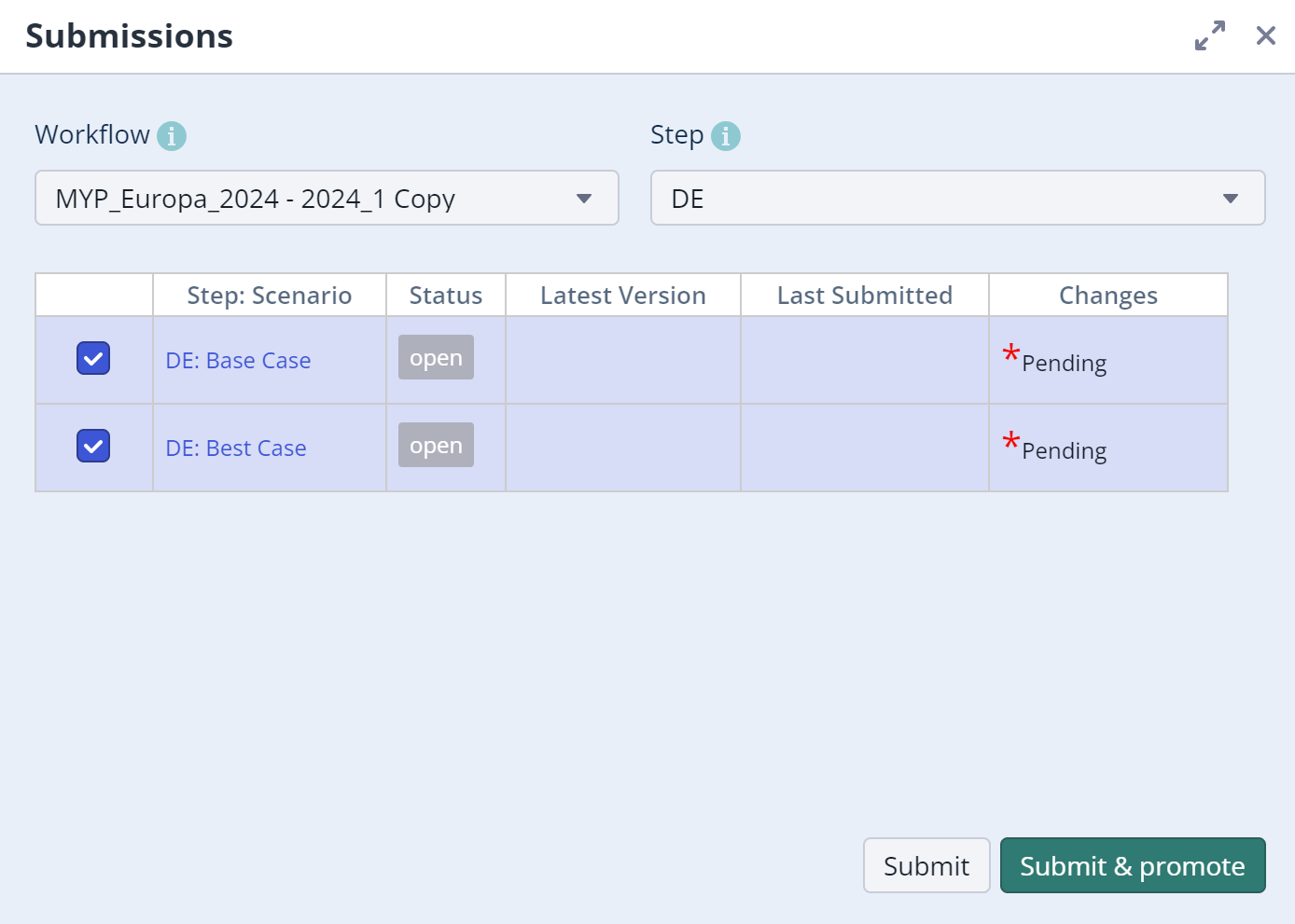 Once you have finalized your Scenario by creating assumptions and line items, and filled in all the necessary tables and figures, you can submit your Scenarios for potential review. To do this, navigate back to the Workflow icon and click on 'Submissions'. If necessary, select the required Workflow and step again. You will see a list of all your Scenarios included in that Workflow.