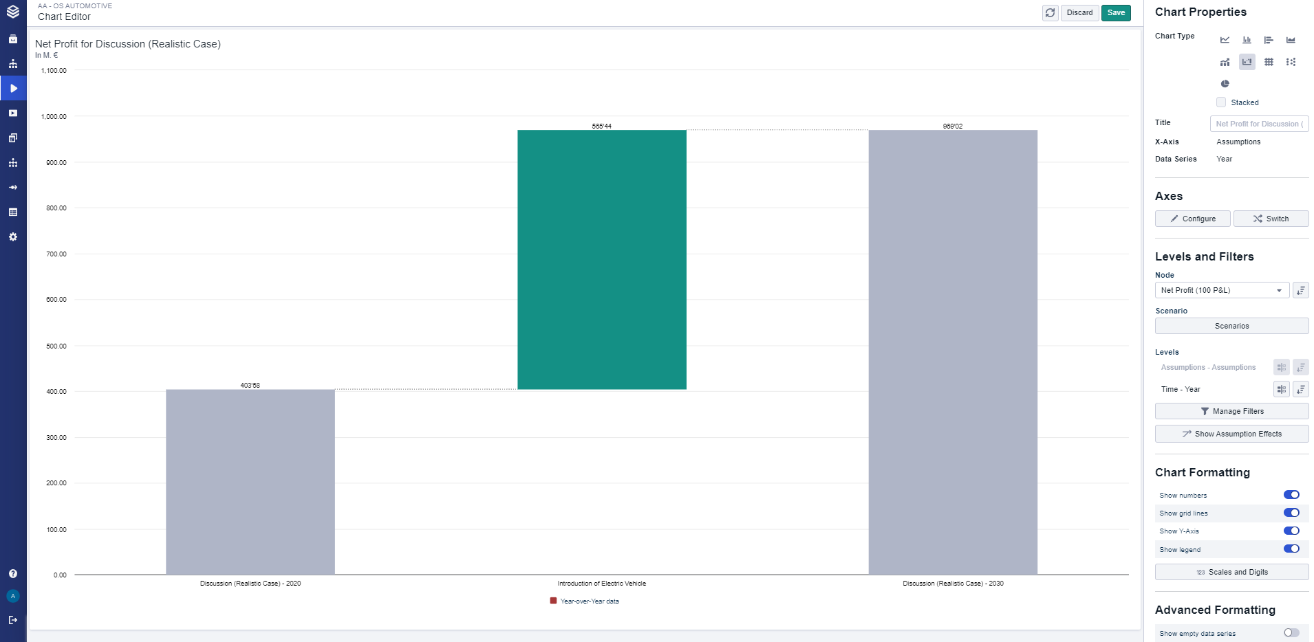 Scenario bridge/Bridge charts display the effect of active assumptions; you can show the effect of all assumptions or the effect of each line item inside the assumptions.