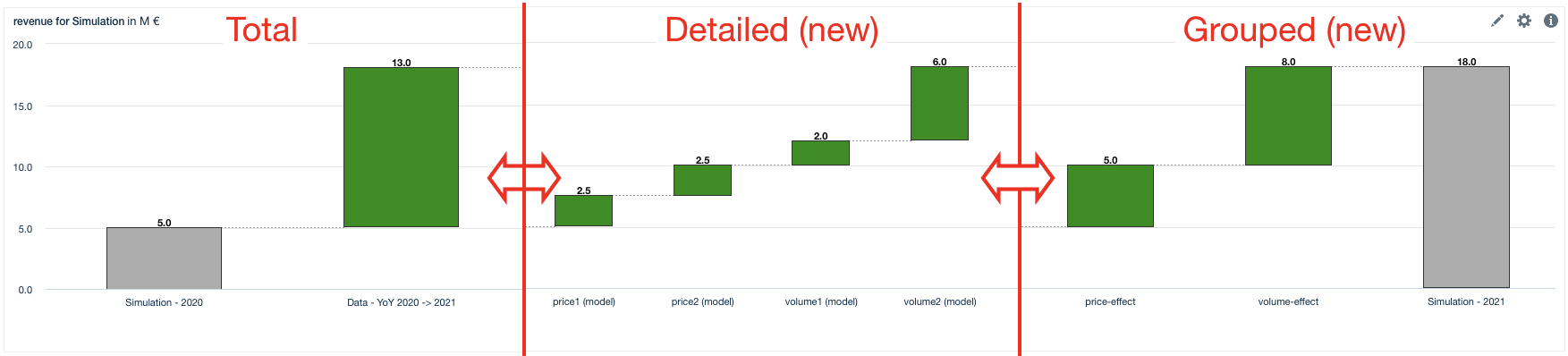 Changes from data in your model show up in a bridge by default as one "Data YoY 2020 → 2021" block (in the image below "Total").
