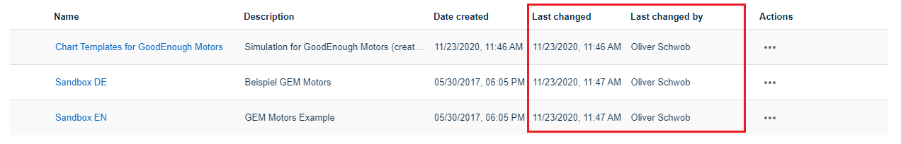 Simulation projects now display a "Last changed" and a "Last changed by" column to provide transparent information about the latest activity and user.