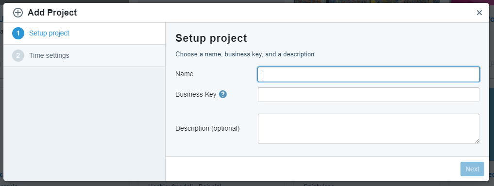 This process involves 2 major steps where you as a user enter the name of the project, a business key, and a description.