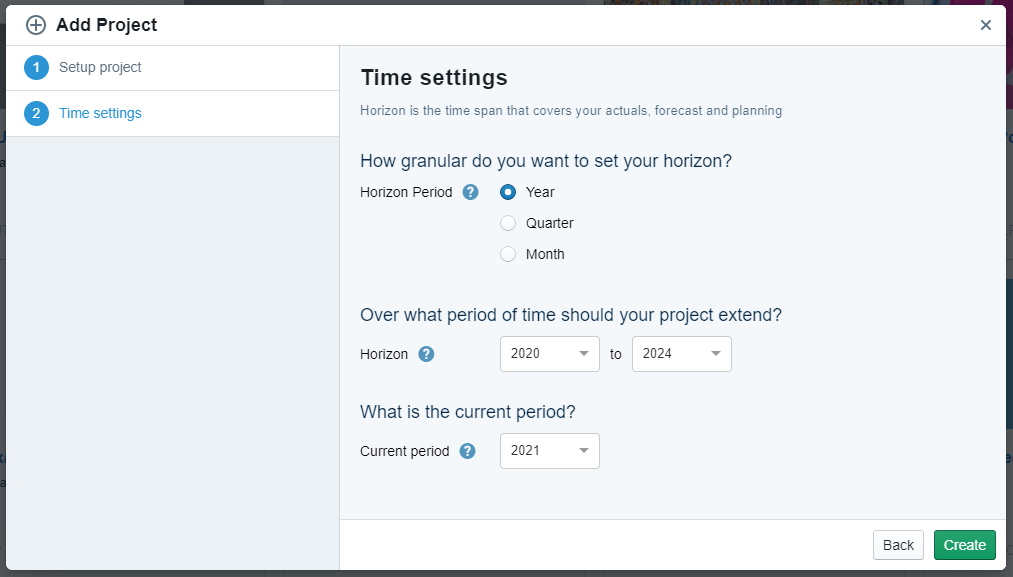 After that, the process leads you to the second step where you can enter the time settings for your project and ultimately create the project.