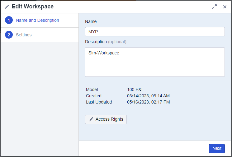 When editing an existing model or workspace, the settings no longer open on the right side of your screen. From now on, a dialog opens that inherits all the settings that can be adjusted. This dialog enables a more condensed and guided view onto the settings of a model or workspace