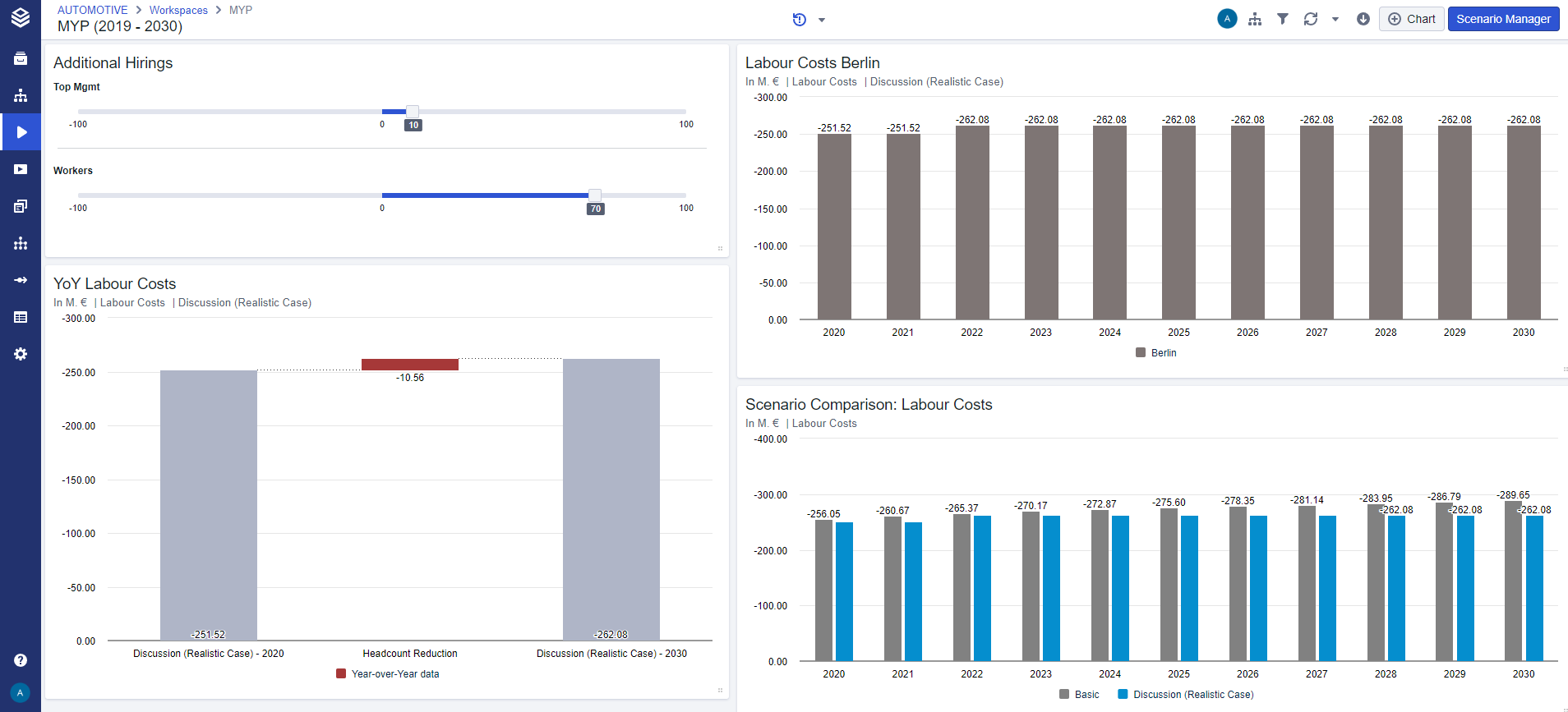 This enables faster and more focused ad-hoc simulations. Compared to adding the entire Scenario Manager to your worksheet, single slider tiles take much less space and do not show other line-items or scenarios.