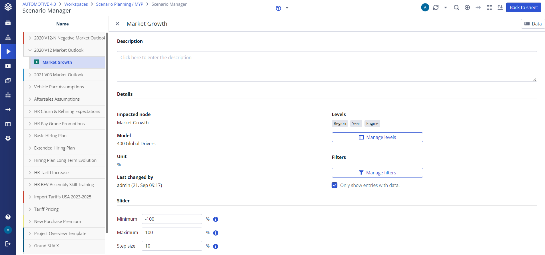 With this release, Valsight introduces the opportunity to display single or multiple sliders in tiles on your worksheet without having to insert the entire Scenario Manager.